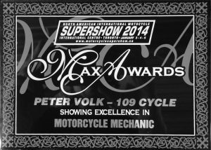 109 Cycle and Peter Volk were awarded the Canadian Motorcycle Supershow 2014 MAX Award in the category of Excellence in Motorcycle Mechanic.